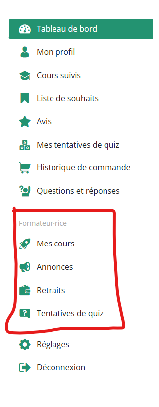Exemple d’un tableau de bord avec le menu Formateur·rice :